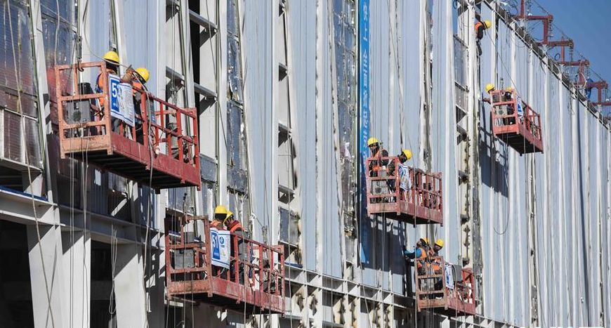 目前,施工现场正如火如荼地建设,8个单体同时施工,会议中心等7栋单体进入了装饰装修阶段,企业临时用房进入集成房屋大面积吊装阶段。